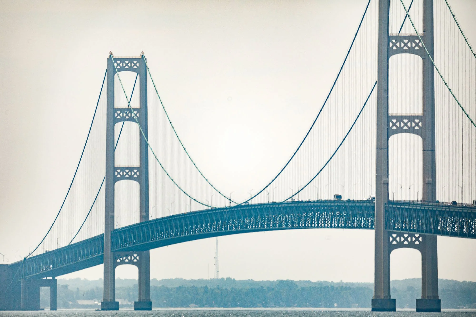 View of the Golden Gate Bridge with two towers, suspended cables, and a cloudy sky in the background. View fullsize