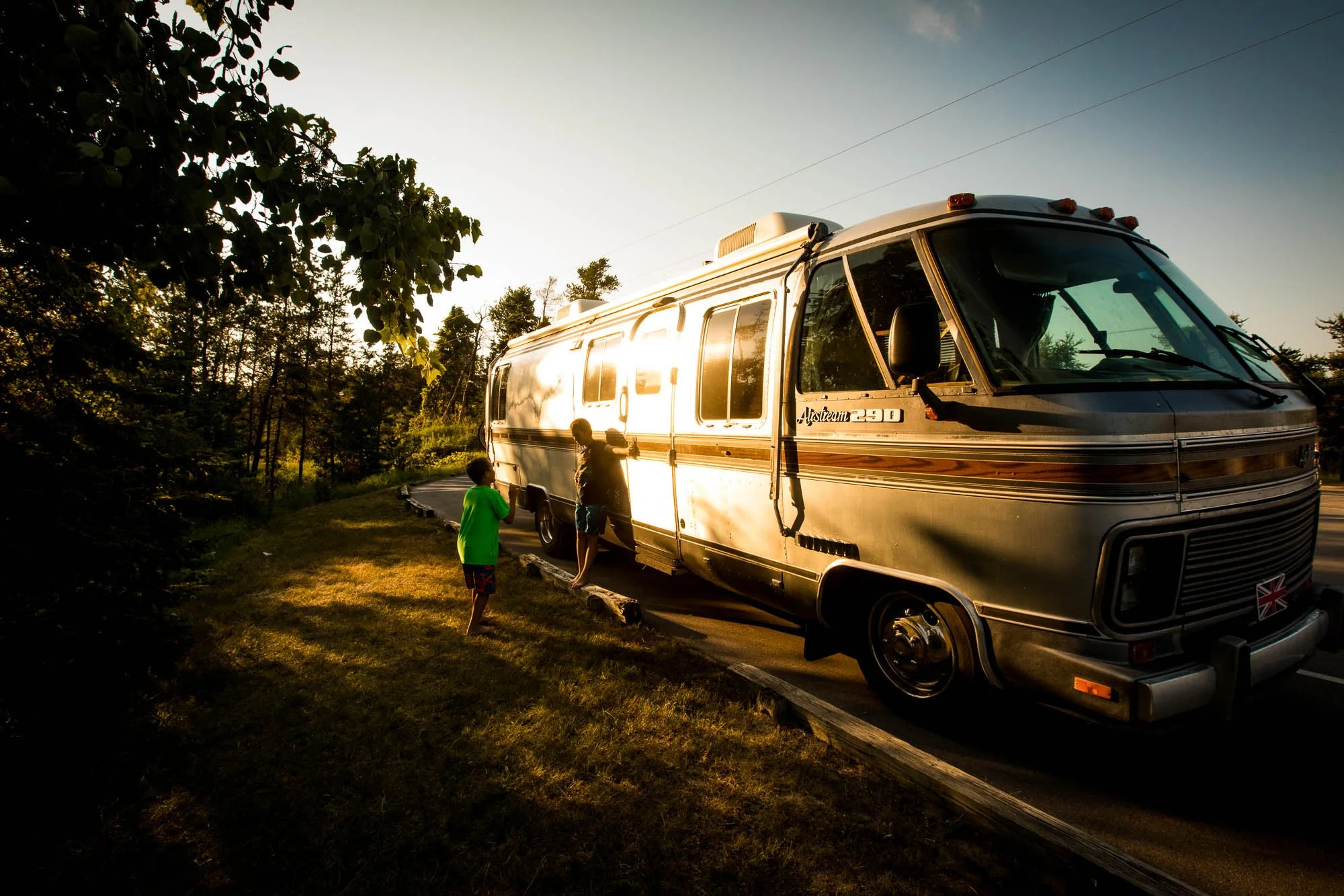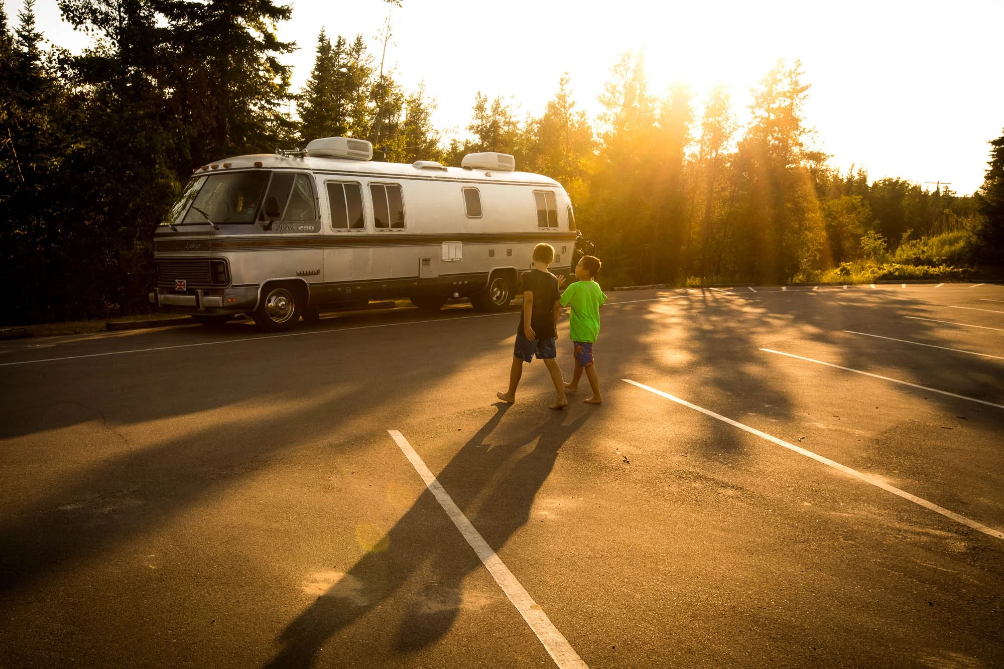Two children walking in a parking lot near a vintage campervan during sunset. View fullsize