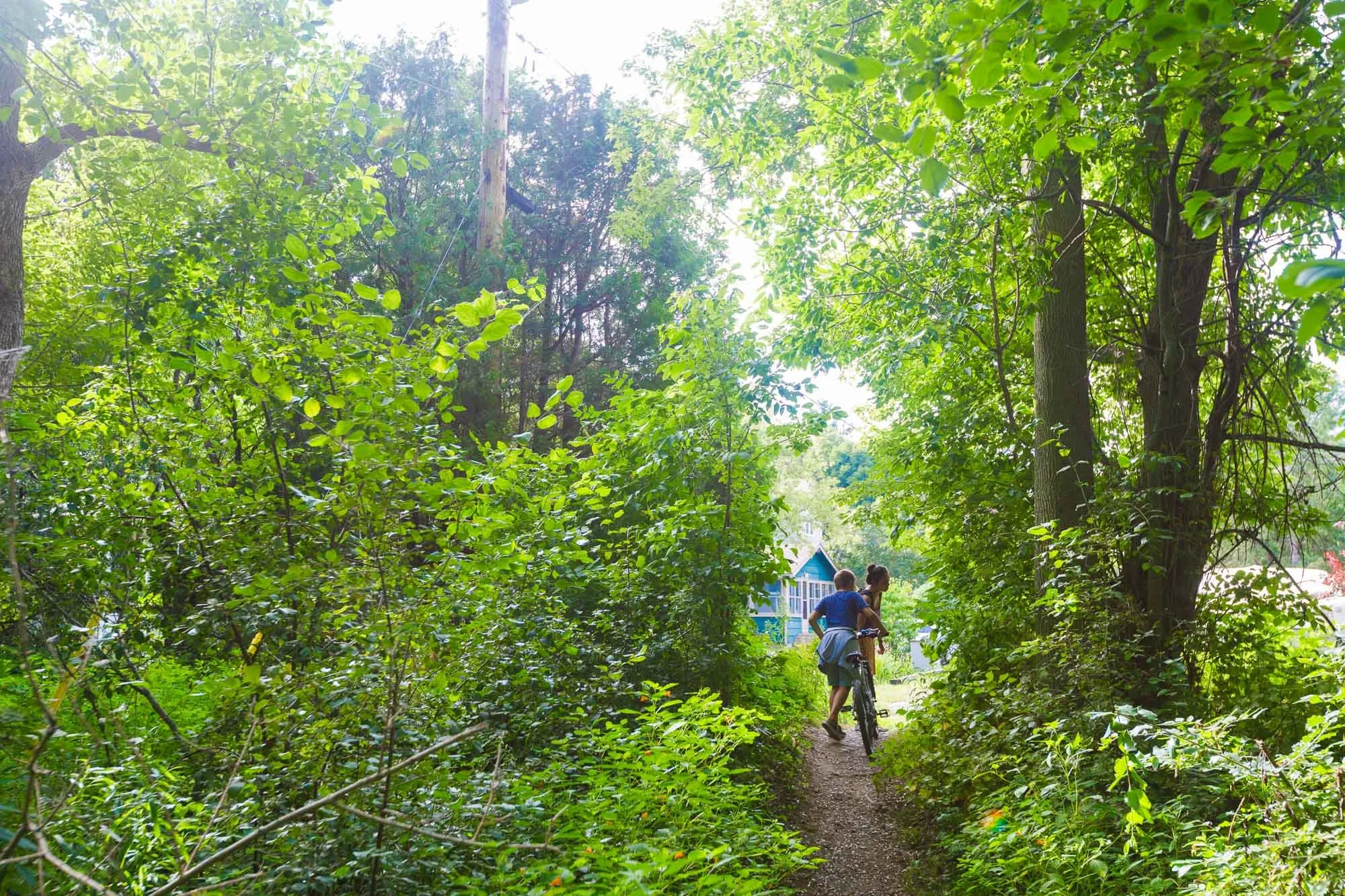 Two people, one on a bicycle, walking on a narrow dirt trail through a dense, green forest with tall trees and lush foliage.