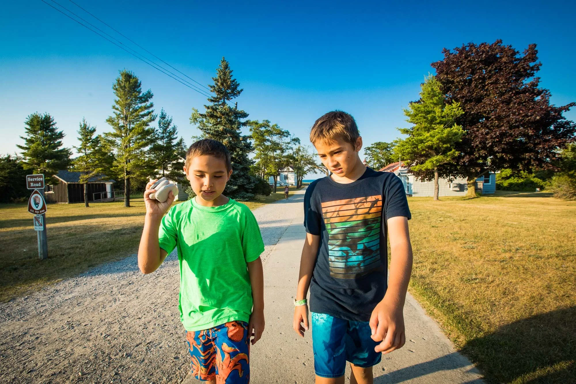 Two young boys walking along a sidewalk on a sunny day with trees and houses in the background. View fullsize