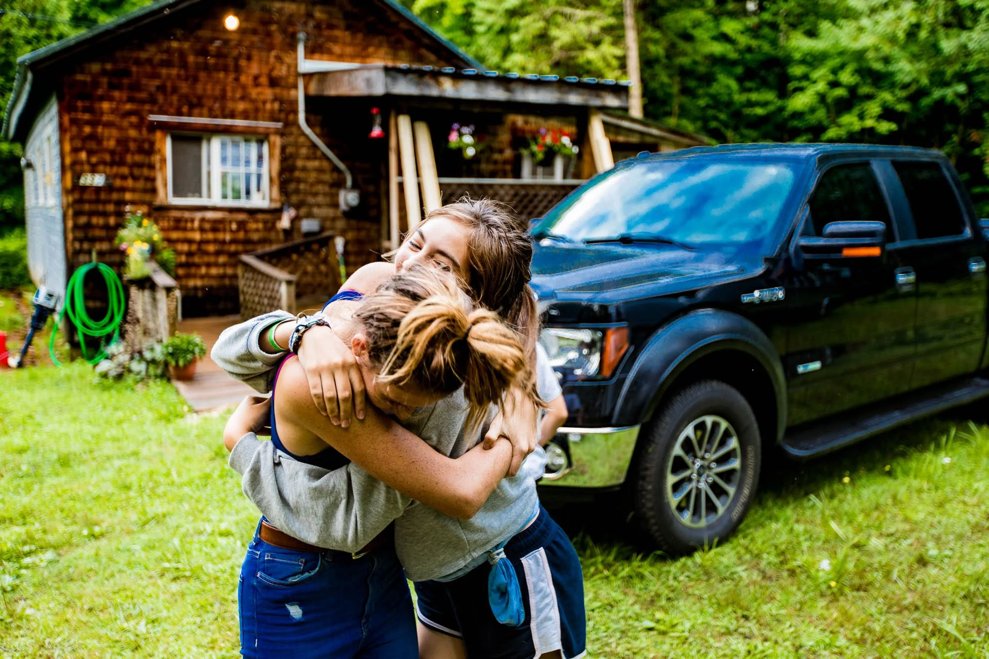 Two young women hugging and smiling in front of a black pickup truck and a wooden house in a grassy yard with trees in the background.