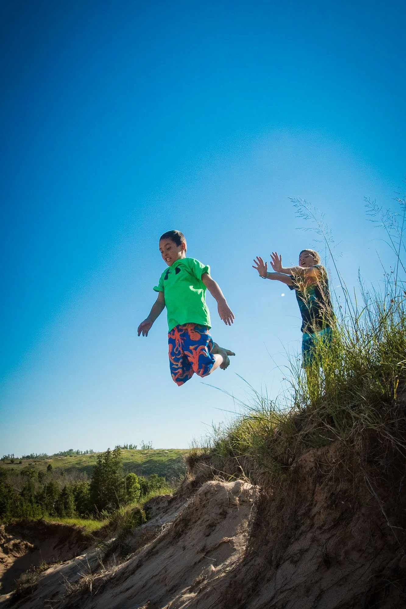Two children playing outdoors, one jumping off a small dirt hill while the other reaches out towards them, under a clear blue sky. View fullsize