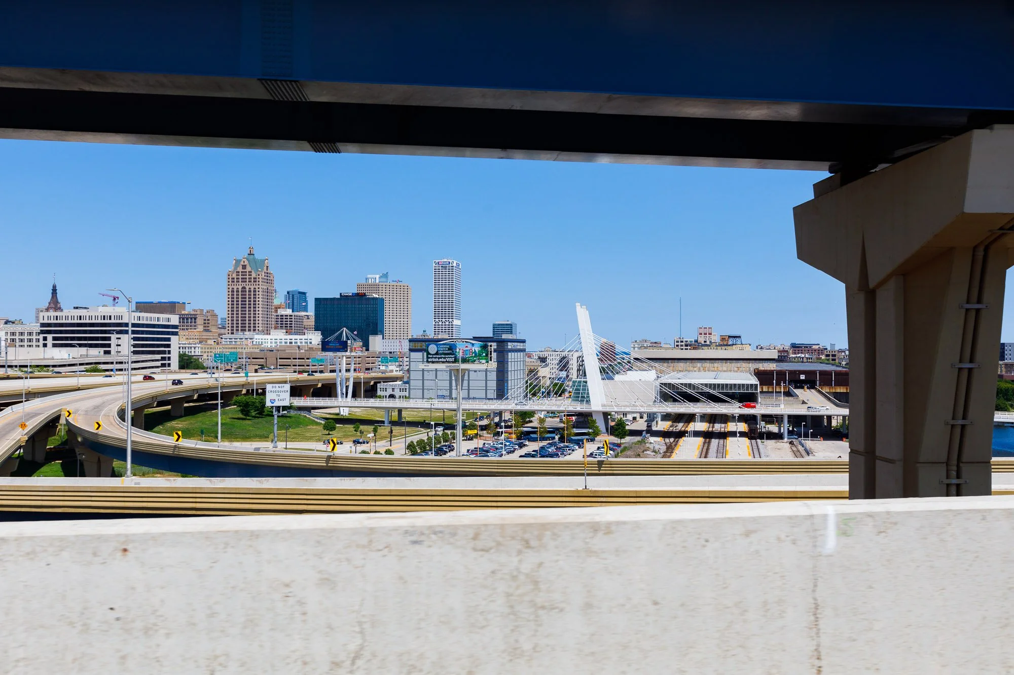 City skyline with tall buildings, highway, and modern bridge with white cables, seen from under an overpass on a clear, sunny day. View fullsize