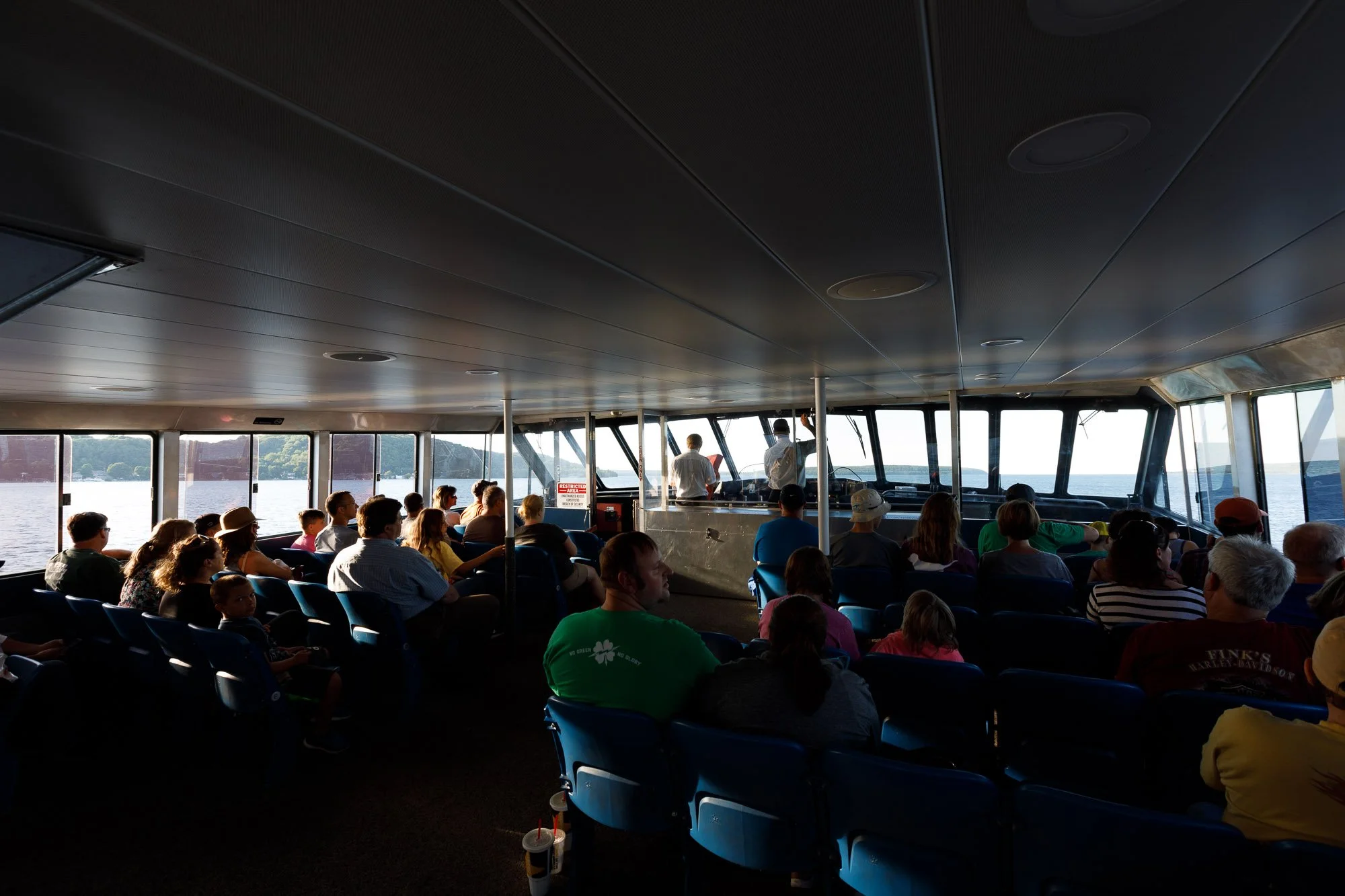 People seated inside a boat's cabin, facing forward, with windows showing water and land outside, as crew operates the vessel. View fullsize
