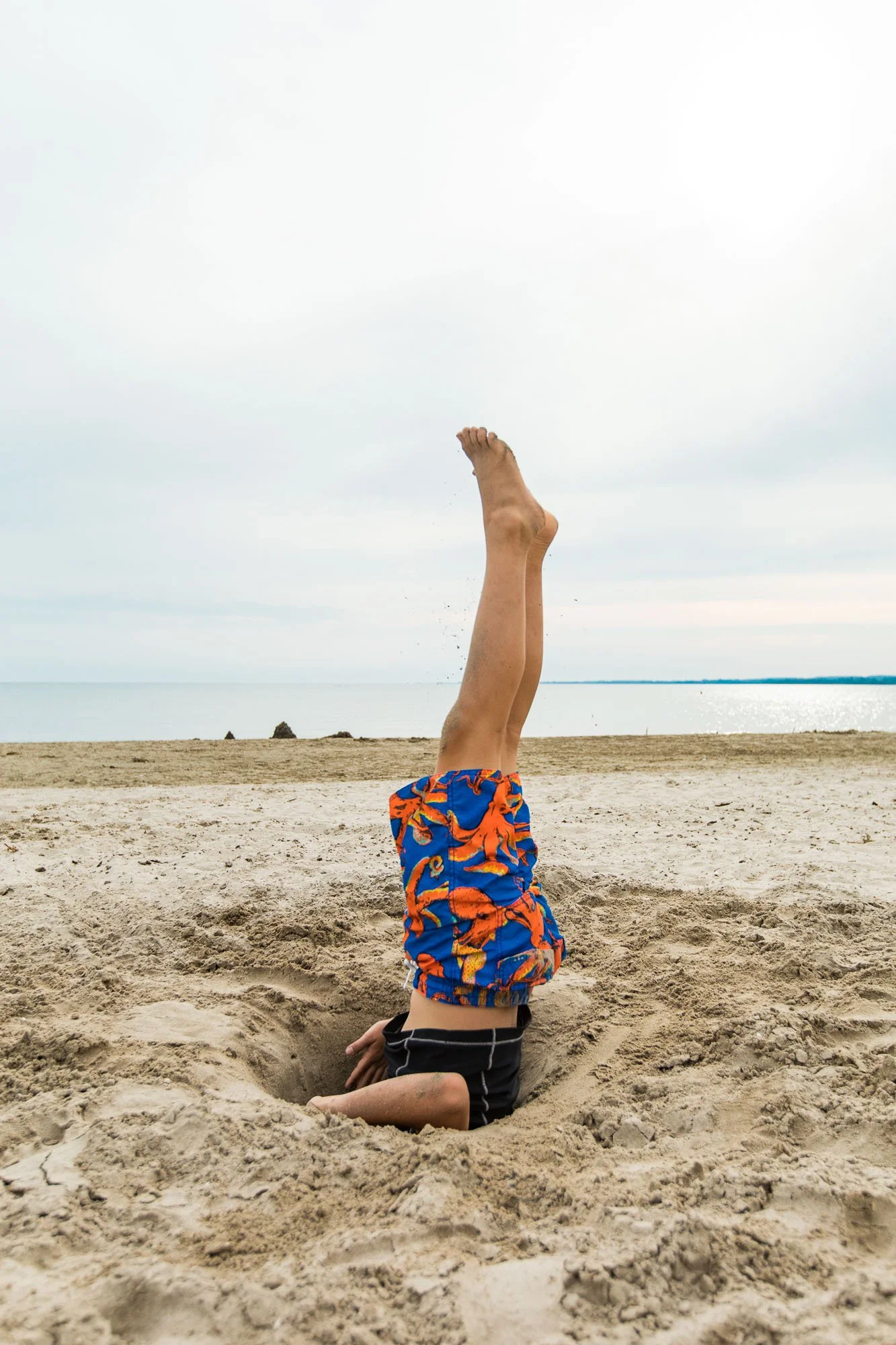 A person doing a headstand in a sandbox on the beach, with their legs raised straight up. The person is wearing colorful swim shorts with an orange and blue pattern. The background shows the beach, water, and an overcast sky.