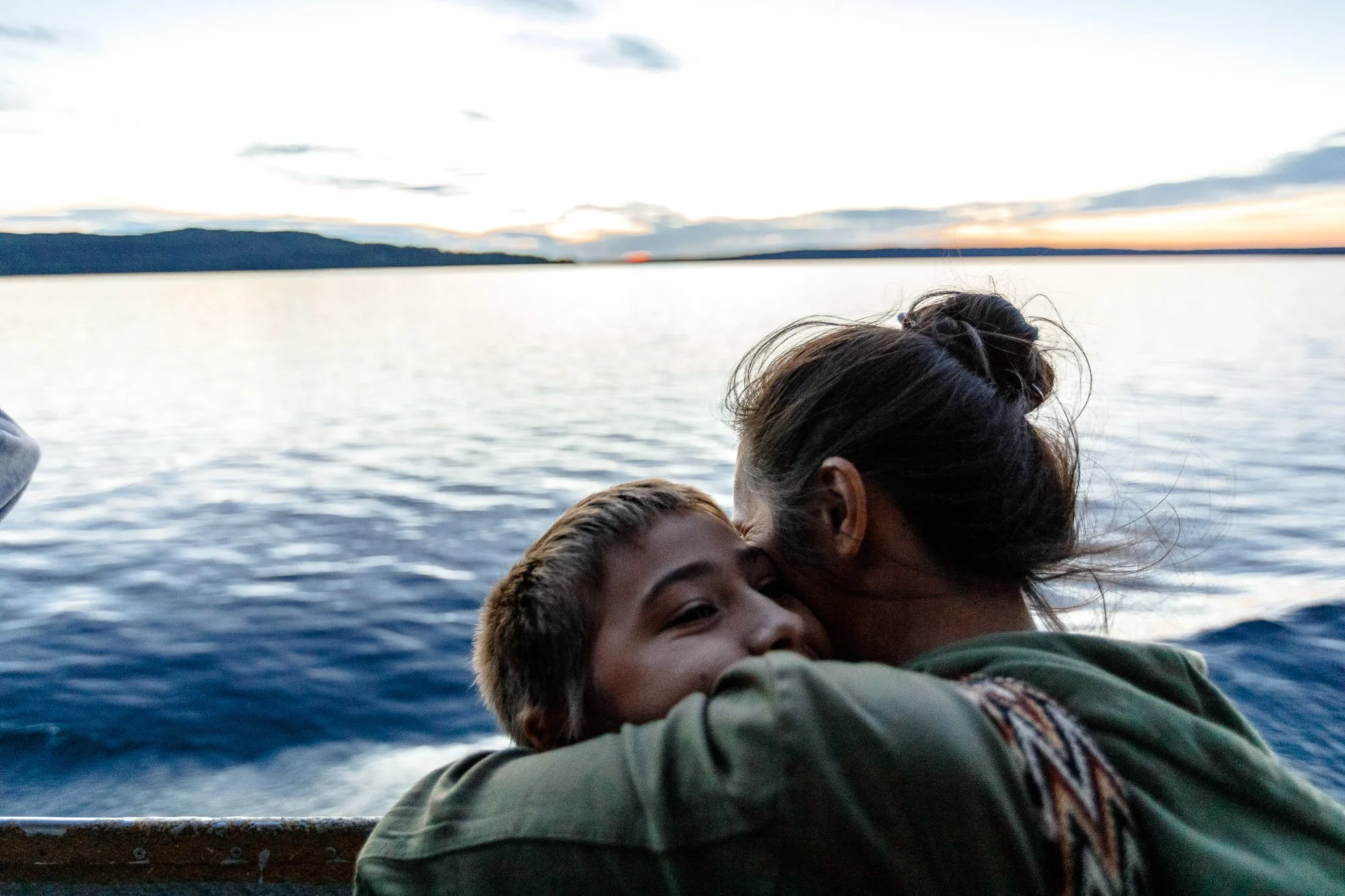 A woman and a young boy sharing a hug on a boat with a body of water and a sunset in the background.