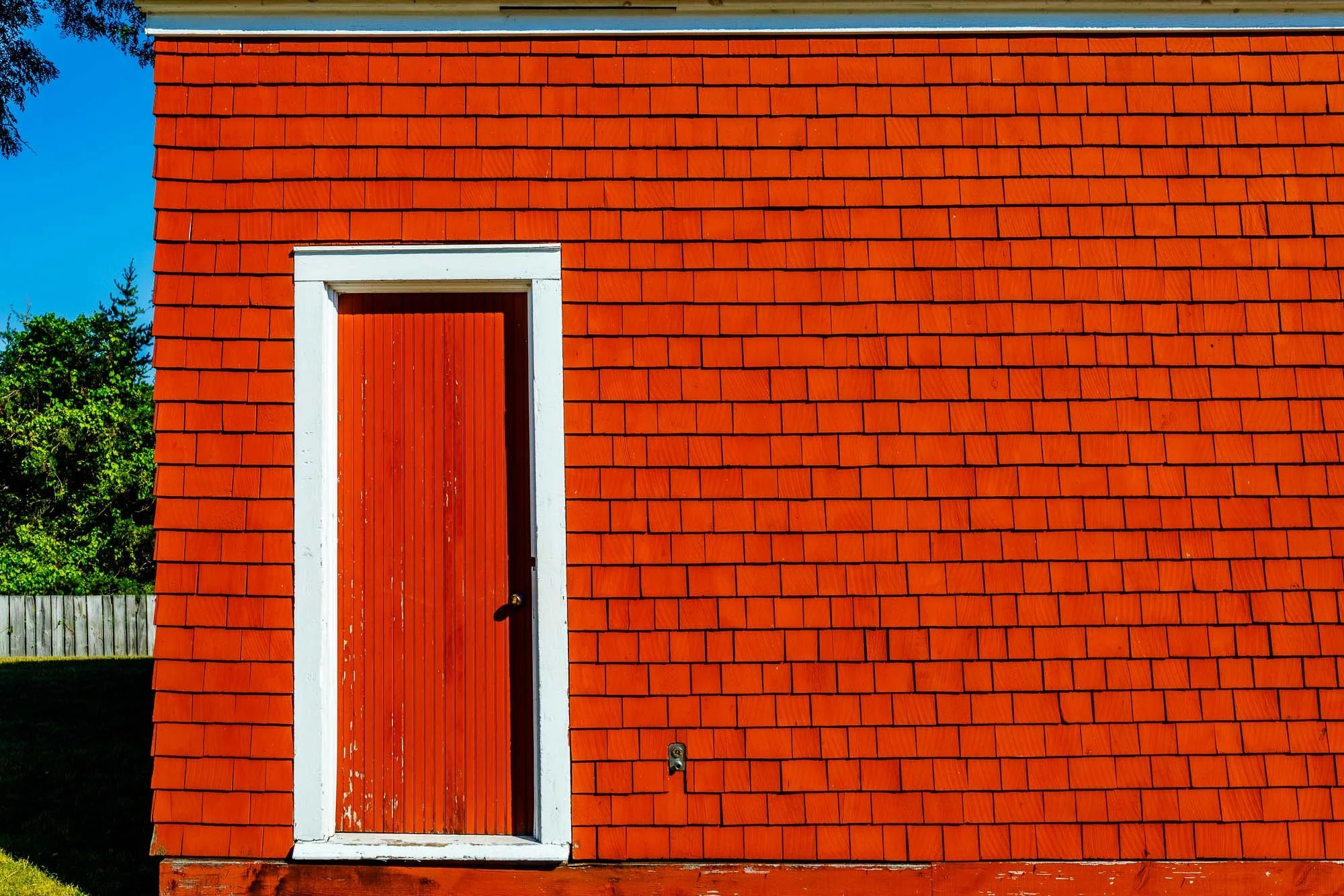 A red building with a door missing, white trim, and a shadow on the ground, sunny day with green trees and blue sky in the background. View fullsize