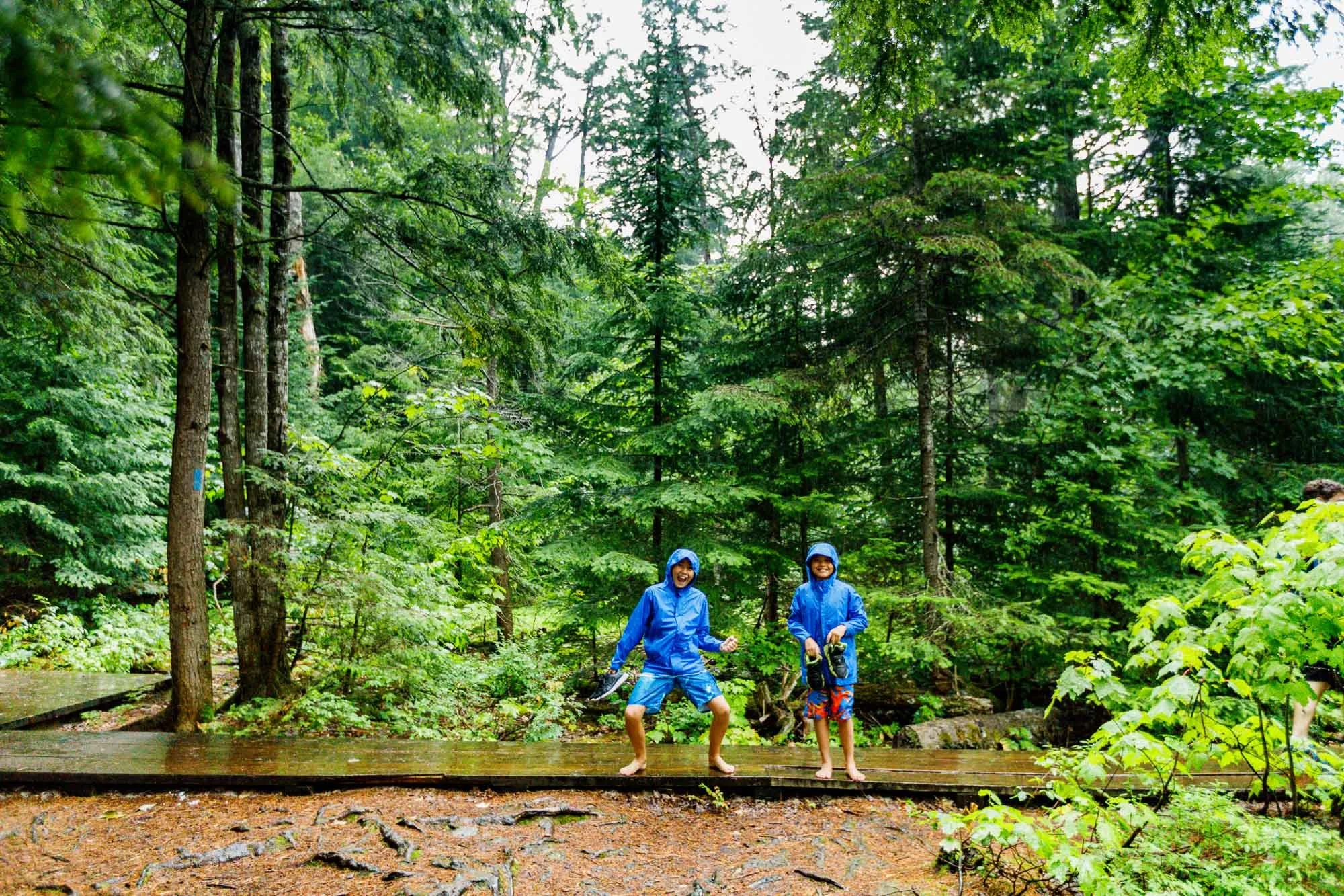 Two children wearing blue raincoats and holding their shoes stand on a wooden path in a lush, green forest with tall trees and dense foliage. View fullsize