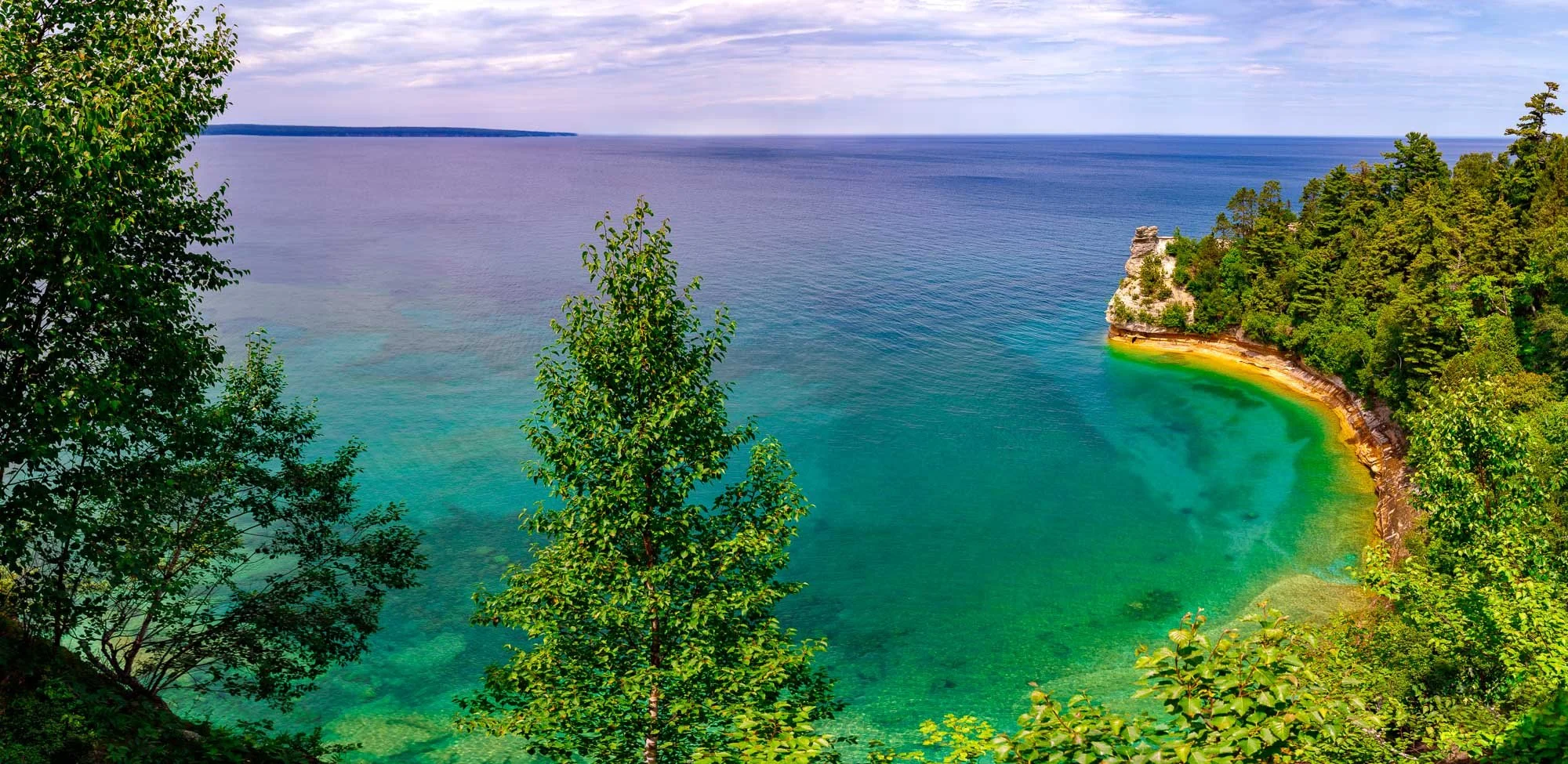 A scenic coastal view of Lake Erie with clear turquoise water, a leafy green shoreline, and a white rocky cliff on the right, under a partly cloudy sky.
