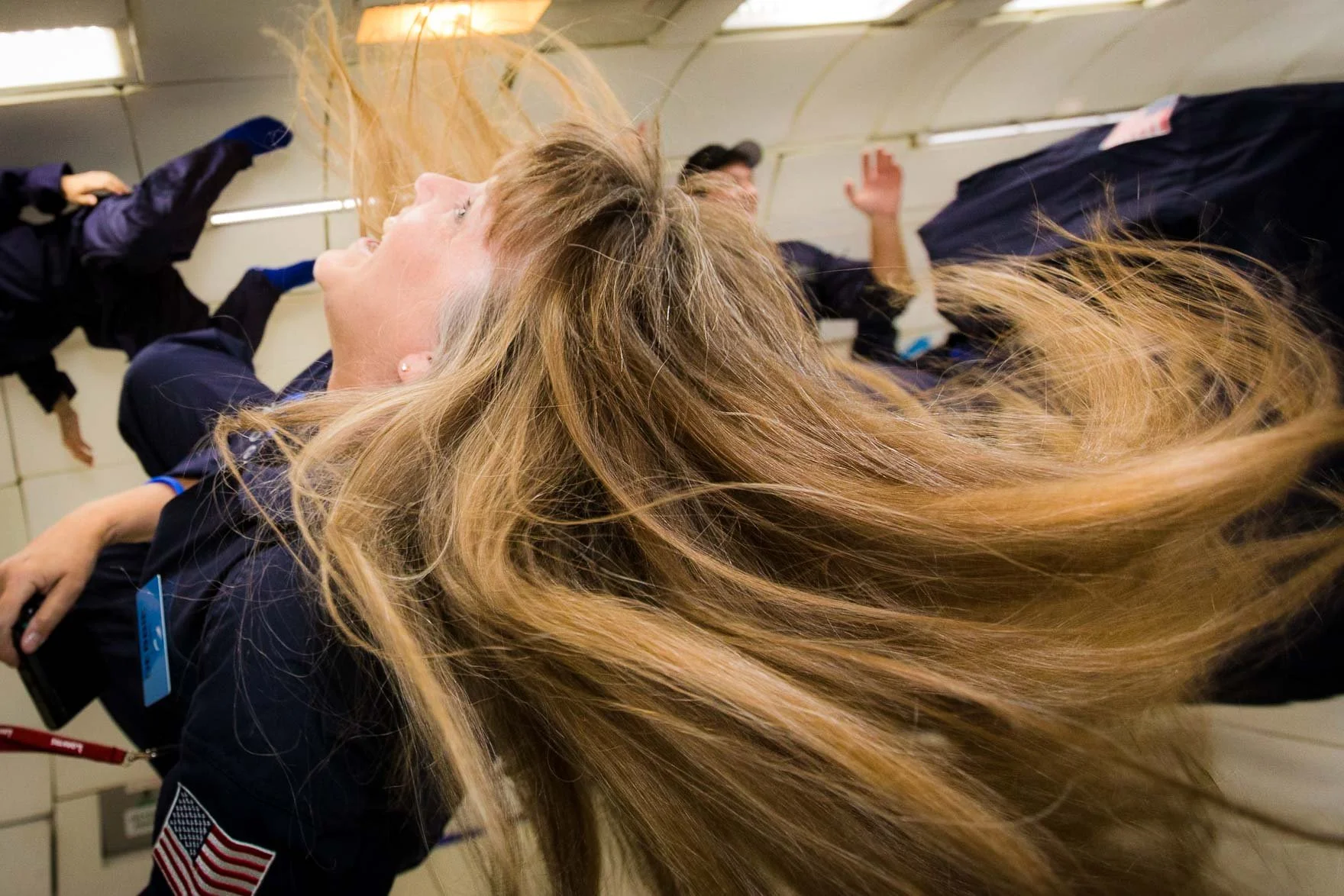 Woman floating inside a zero gravity chamber, smiling with her arms outstretched, hair floating upward, wearing a dark jumpsuit with Zero G logo.